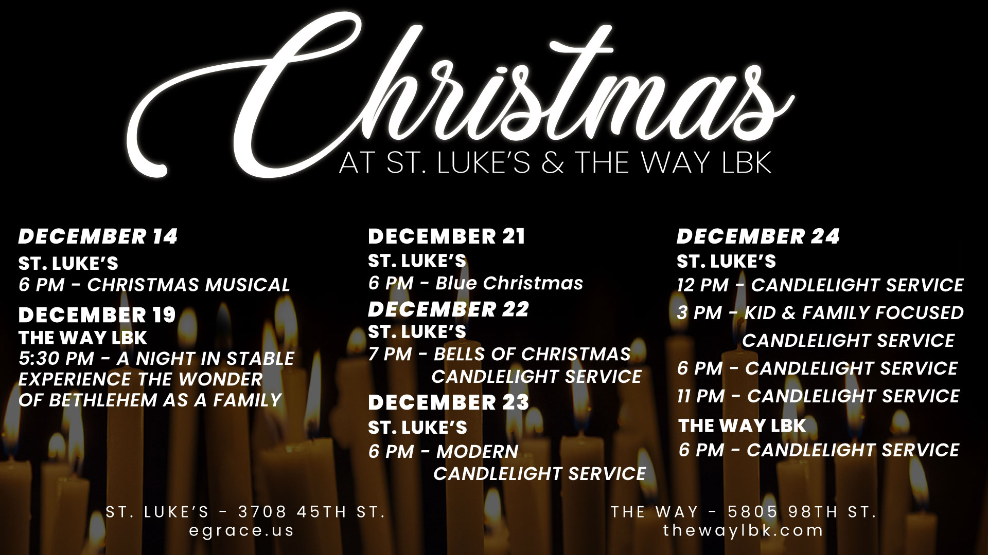 Come celebrate the joy and hope of Christmas with St. Lukes Lubbock! We invite you and your family to join us throughout the season as we remember the wonder of Christ’s birth through meaningful gatherings, candlelight services, and family-friendly experiences. Whether you’re looking for a peaceful moment, a place to celebrate with loved ones, or a fresh reminder of God’s love, we have a place for you.